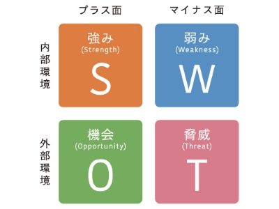 自社の「強み(Strengths)」「弱み(Weaknesses)」、